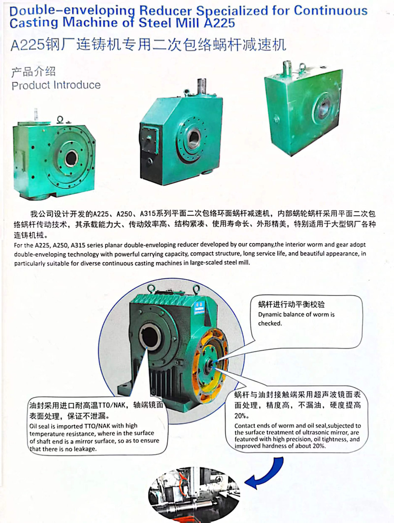 我公司生產(chǎn)的A225、A250、A315系列平面二次包絡(luò)環(huán)面蝸桿減速機(jī),內(nèi)部蝸輪蝸桿采用平面二次包絡(luò)蝸桿傳動(dòng)技術(shù),其承載能力大,傳動(dòng)效率高,結(jié)構(gòu)緊湊、使用壽命長(zhǎng)、外形精美、適用于大型鋼廠各種連鑄機(jī)械。