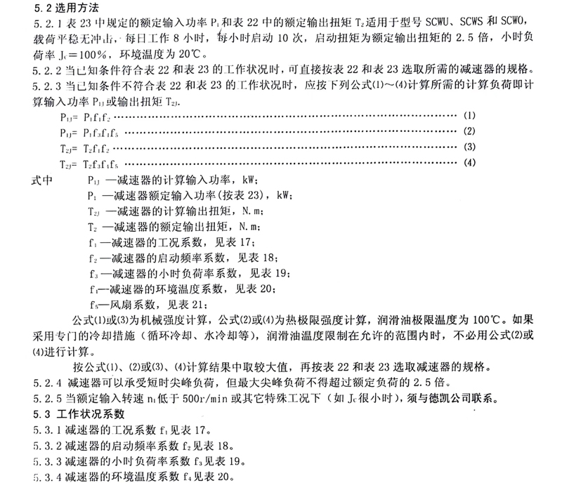 SCW減速器在選用的時候需要滿足以下條件:原動機類型,額定輸入功率、輸入轉速、工作機類型、額定輸出扭矩、最大輸出扭矩、傳動比、載荷性質、裝配型式、環境溫度。